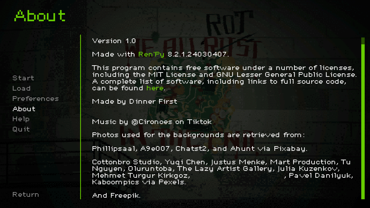 looking cool so far! always love me some sus psychological dystopian theme, aside from tiny typos nothing a little patch can fix.. there was this one invisible name in the credit.